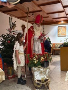 Der neue Sektionsvorsitzende Reinhard Wölfl ließ sich zu seiner „Premiere“ bei der Adventsfeier etwas Besonderes einfallen: In Gedichtform begrüßte er die Gäste, beginnend mit: „Griaß God beianand, ihr lieb’n Leit, es is so schön, es is so weit. Der Advent stellt still seine Kerzen ein und warmer Kerzenschein zieht in die Herzen ein“. Andächtig lauschten alle den schönen Reimen, dann begann das Programm mit dem Gedicht „Winterfreud“, vorgetragen durch Ursula Stober. Dann trat auch schon der Nikolaus (Martin Weinberger) durch die Tür. Begleitet wurde er von einem bezaubernden Engelchen (Teresa Eder), das ganz schön zu schleppen hatte an dem mit Geschenken vollgepackten Schlitten. In seinem Goldenen Buch hatte der Nikolaus allerhand über die Vorstands- und Ausschusskolleginnen und -kollegen notiert. Großes Lob ernteten die fleißigen Mitglieder, die das Grassert für die Paradeisl gesammelt hatten, und Dietrich Ritter, der die Gestelle für die Paradeisl mit einem neuen System ausgestattet hatte, damit sie leichter zusammengefügt werden können.