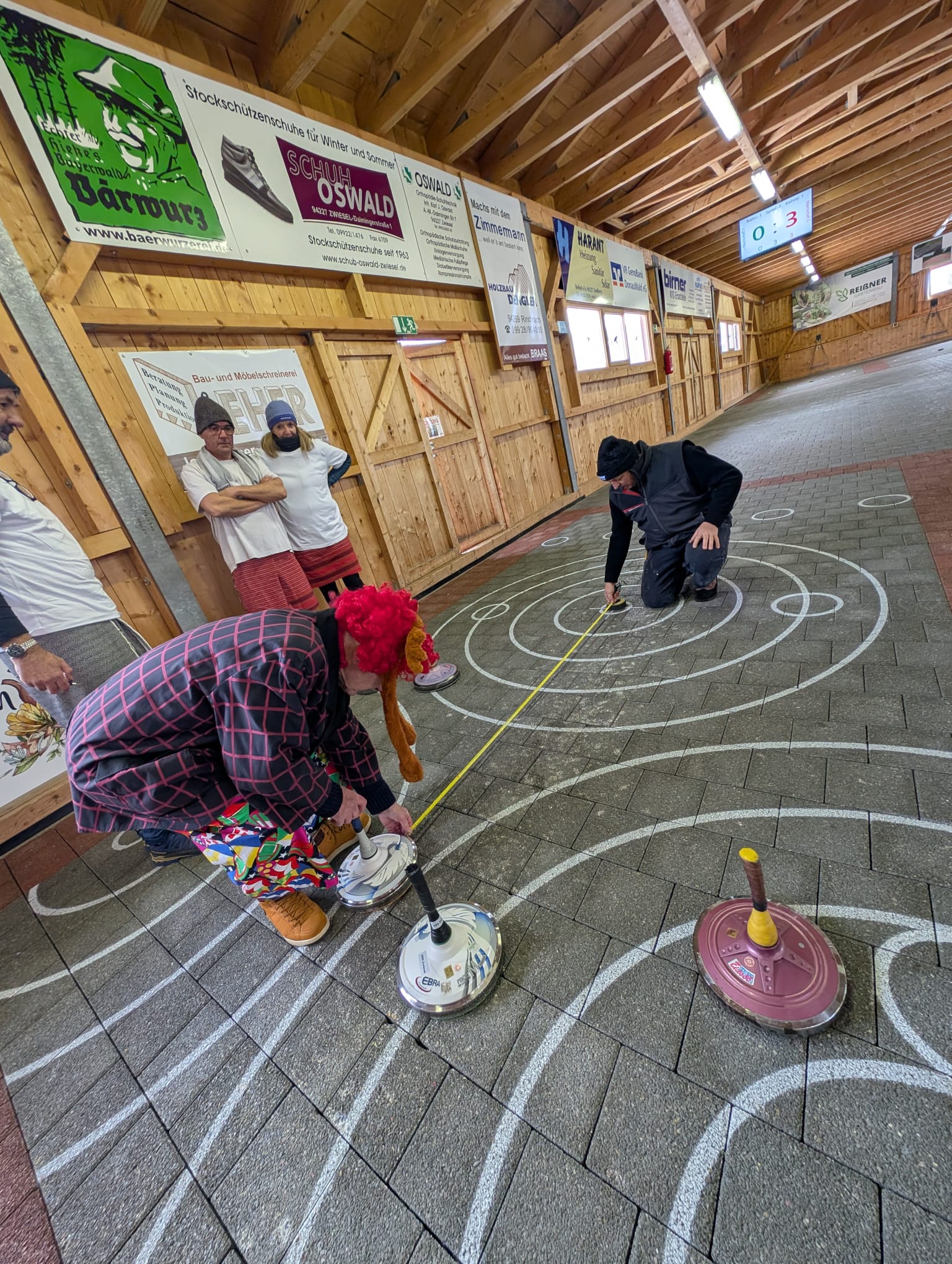 Eisstockwart Kuchler Franz griff tief in den Hallenfundus und versorgte alle Teilnehmer mit passendem Sportgerät. Schiedsrichter Leo Kolb erklärte in einer kurzen und verständlichen Regelkunde den Ablauf des Wettbewerbs und sorgte dafür, dass trotz Fasching niemand den Überblick verlor. Unterstützt wurde er dabei von seinem Sohn Stefan Kolb, der den Anfängern mit viel Geduld die richtige Technik zeigte und so manchen Stock sicher ins Ziel brachte.